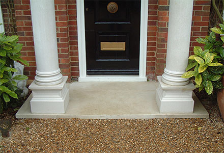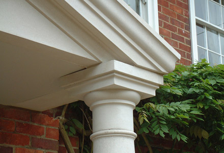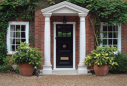 The triangular portico consists of a triangular front pediment and shorter side lintels supported on columns at the front and pilasters or brickwork at the back. It is available using columns and pilasters in either Corinthian or Tuscan styles.